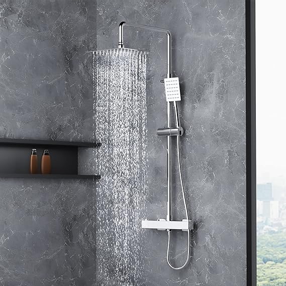 The wall-mounted shower set with a 3-in-1 diverter, shower mixer valve. Shower height can be adjustable between 180 cm to 220cm. 150cm shower Hose, square rain shower and faucet